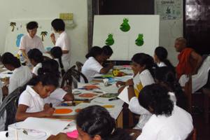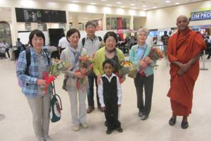 コロンボ空港で花束の歓迎 子供たちはとっても礼儀正しい 保育専門学校の生徒さんたちとパネル絵作り