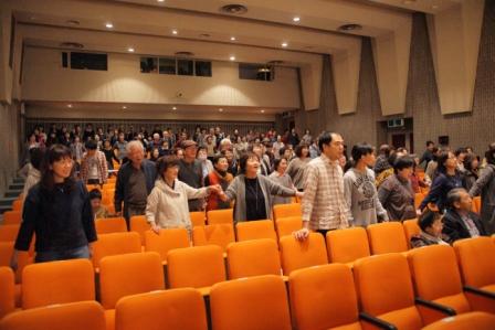 会場一体となって 手をつないで 新井場さんと森永さんは遠い所、駆けつけてくれました