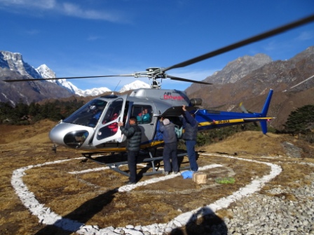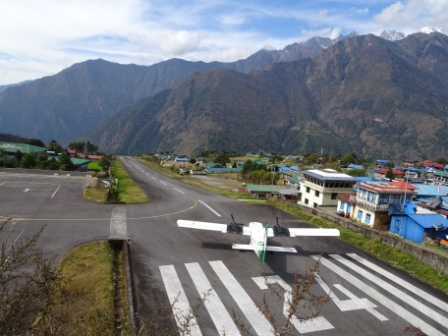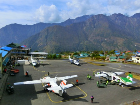 ルクラの駐機場 坂を利用して離陸 いよいよヘリでエベレストビューへ