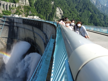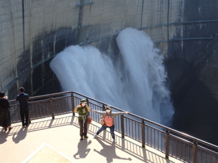 下を見ると吸い込まれそう! 黒部ダムの上で すごい! 放水の迫力