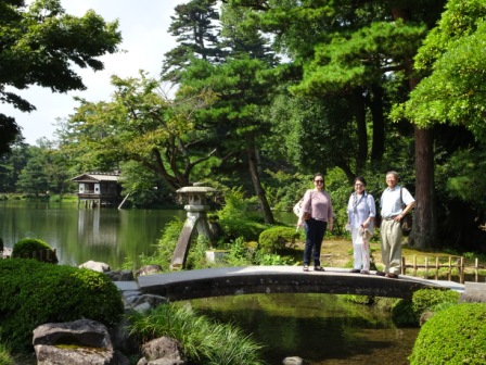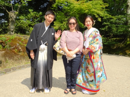 兼六園:霞ケ池と徽軫灯籠(ことじとうろう) 花嫁衣装の新婚のカップルと記念写真 金沢城